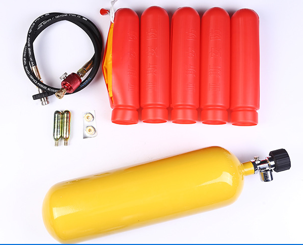 基本配件包含一个内置气缸带折叠枪托的发射体和一次性发射用的33克CO2气瓶。可选配容量6L的压缩空气气瓶(压力范围200/300巴)和充气用快速接头,足够使用20~30次充气发射使用;此压缩空气气瓶是标准空气呼吸器气瓶,里面气体是通过高压空气压缩机填充的干净空气。